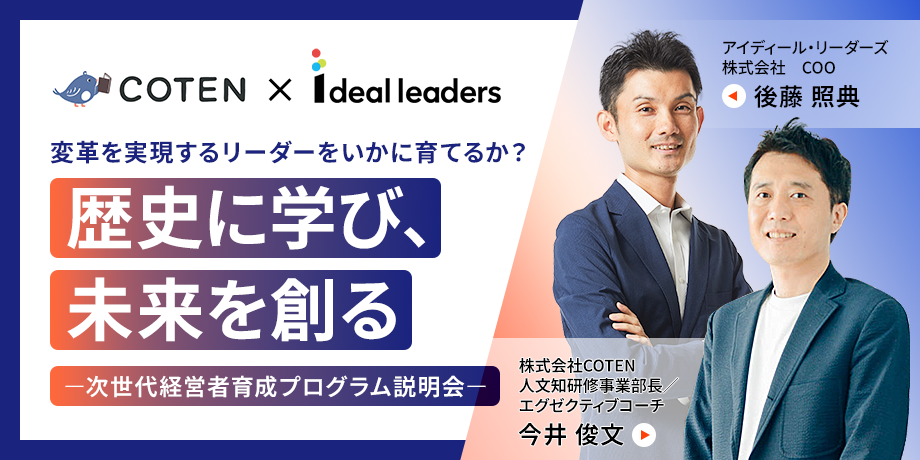 次世代経営層の「視座の低さ」、長年のイノベーション停滞、部門間の連携不全―多くの日本企業が抱える構造的課題の解決策として、アイディール・リーダーズとCOTENが次世代経営者育成プログラムを共同開発しました。従来のリーダー育成は「未来」と「全体最適」に偏重していましたが、本プログラムは「歴史」という時間軸を加えることで視座を飛躍的に向上させます。COTENラジオから着想を得た後藤が、歴史の知見をビジネスに応用する「ミッシングピース」の発見から、1年の検討を経て実現した新アプローチについてお伝えします。